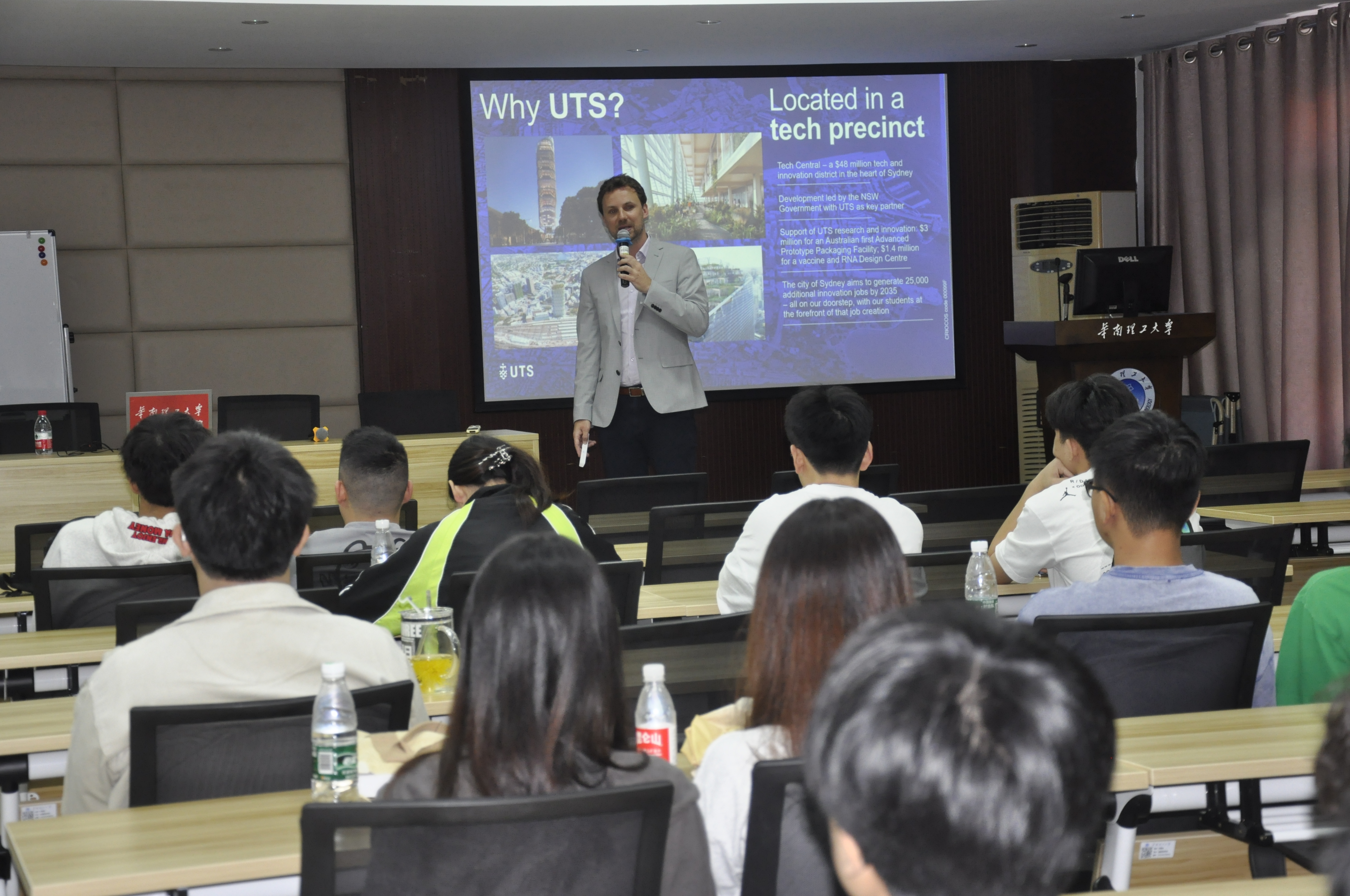 座谈会后,Thomas Wu一行前往学院908报告厅,为我院2+2项目学生带来一场精彩讲座。Chloe Wei首先结合视频,向同学们展示了悉尼科技大学的概貌,介绍了大学排名、地理位置、校园环境及学生就业等基本情况。紧接着Thomas Wu 和Sebastian Kuntze给大家详细介绍UTS商学院、IT及工程学院的学习内容,更有针对性地满足学生了解不同专业的需求。之后,Thomas Wu还为大家上了一堂简短而有趣的”行为经济学“公开课,同学们纷纷表示,在老师的讲授下感受到商科的魅力,对商科的学习更加感兴趣。